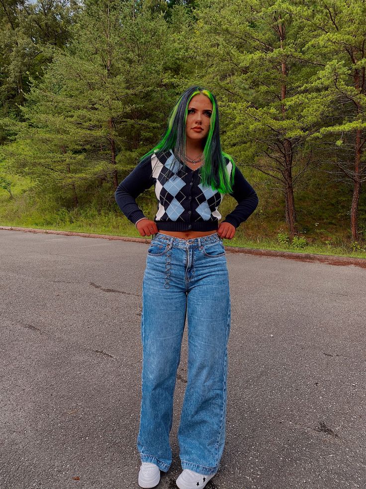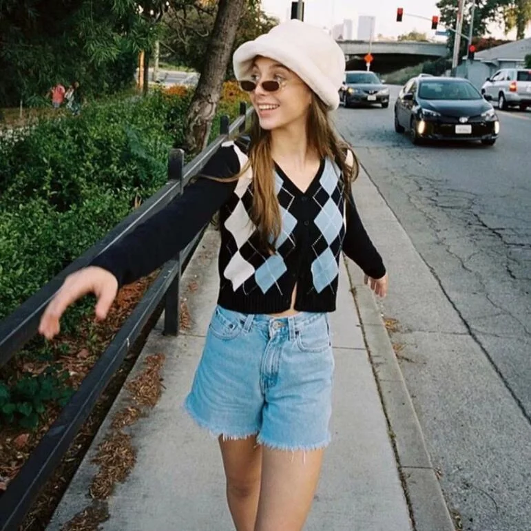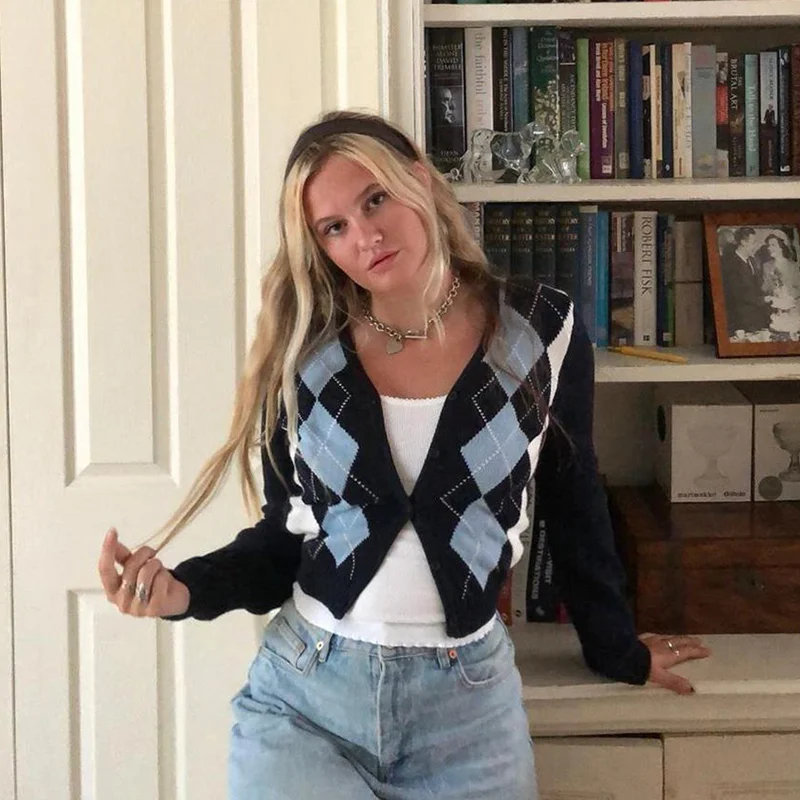 Comfy knit sweater in navy blue with light blue and white argyle print on the front, a v-neck collar, and button-up closure.